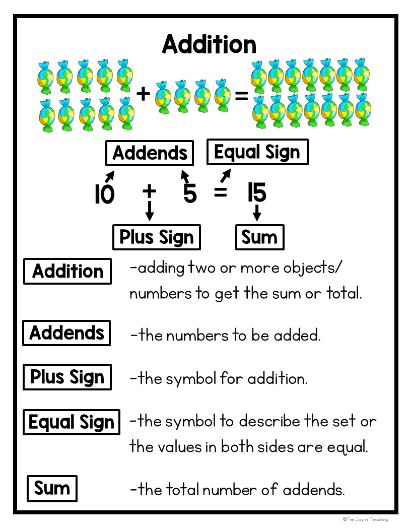 Classroom Tip: Create an Addition Word Wall in your classroom that displays math vocabulary with visual supports like candy or counters. Interactive Idea: Have students “build” equations using cut-out symbols and numbers and label the parts (e.g., which are the addends and which is the sum).