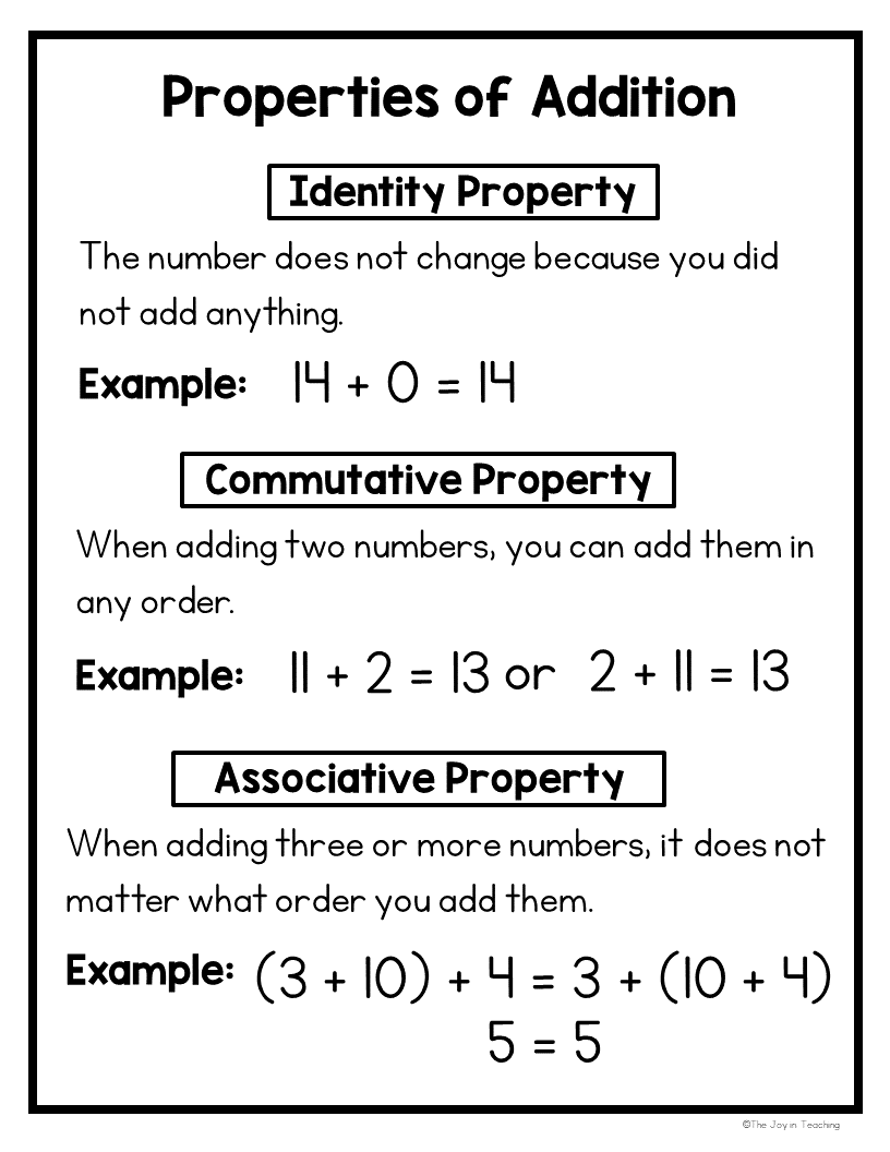 Classroom Tip: Introduce one property at a time with real-life examples (e.g., “If I have 5 candies and you give me 0 more, how many do I still have?”).